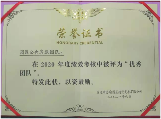 近日,園區(qū)公舍客服條線在2020年建發(fā)公司績效考核中,榮獲“建發(fā)公司優(yōu)秀團(tuán)隊”稱號。